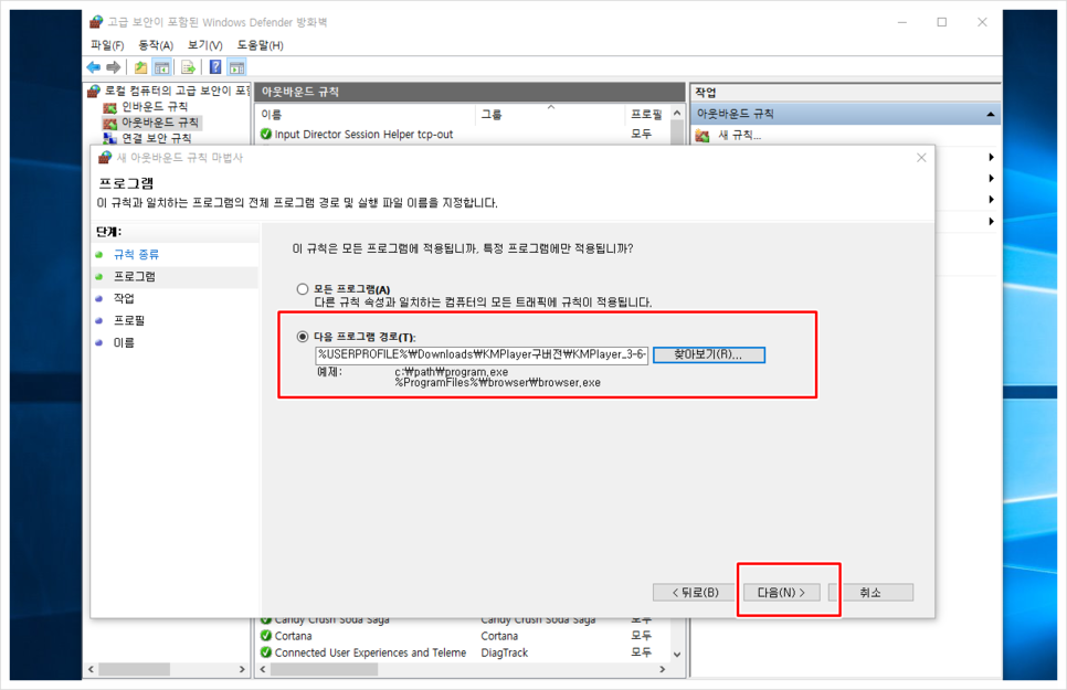 위 이미지에 나타난 거와 같이 프로그램, 다음 선택한 후 다음 프로그램 경로에서 KMP가 설치된 파일 경로를 찾아서 선택하면 되는데, 위 그림의 경로는 KMP를 다른 경로에 설치한 경우이고, 일반적인 경우 내 컴퓨터 - 로컬 디스크 C 드라이브 - KMPlayer - kmplayer.exe를 선택합니다.