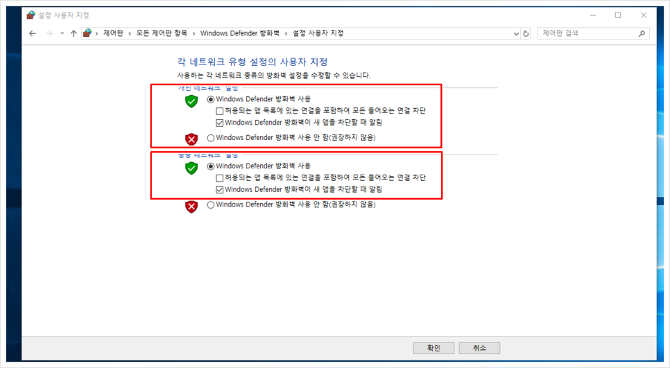 혹시나 다른 이유로 네트워크 방화벽이 위와 같이 초록색이 아닌 빨간색으로 표시되어 있다면 아래와 같이 초록색으로 변경해 주셔야 합니다.
