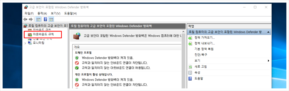 고급 설정을 누르면 위와 같은 항목이 나타나는데, 그곳에 좌측의 아웃바운드 규칙을 선택한 후 두 번째로 새 규칙을 클릭합니다.
