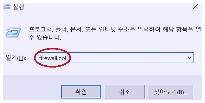 우선, 제어판 항목에서 시스템 및 보안을 찾아서 들어가는 방법이 있고, 아니면 위 그림에서처럼 윈도우 검색창 혹은 윈도우 키 + R을 눌러서 firewall.cpl을 입력하여 Windows Defender 방화벽 항목으로 들어갑니다.