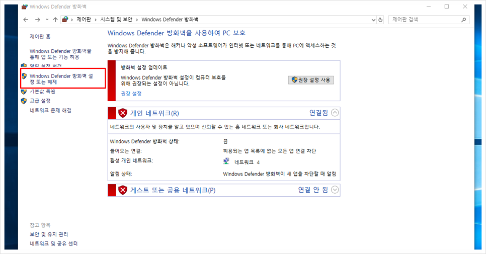 혹시나 다른 이유로 네트워크 방화벽이 위와 같이 초록색이 아닌 빨간색으로 표시되어 있다면 아래와 같이 초록색으로 변경해 주셔야 합니다.