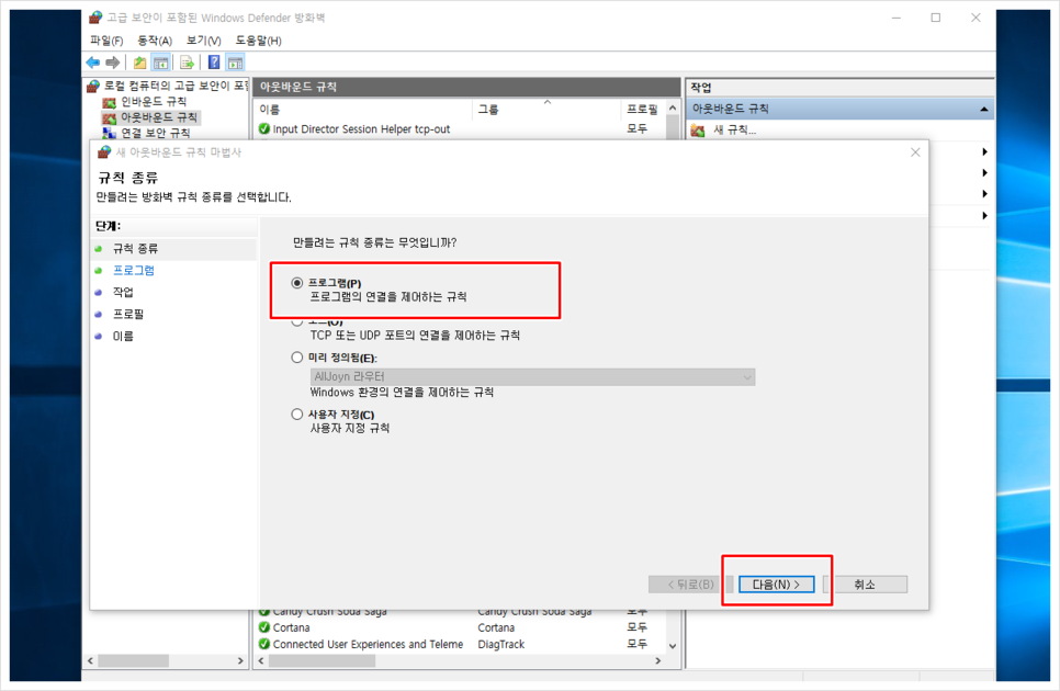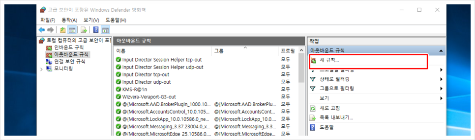 고급 설정을 누르면 위와 같은 항목이 나타나는데, 그곳에 좌측의 아웃바운드 규칙을 선택한 후 두 번째로 새 규칙을 클릭합니다.