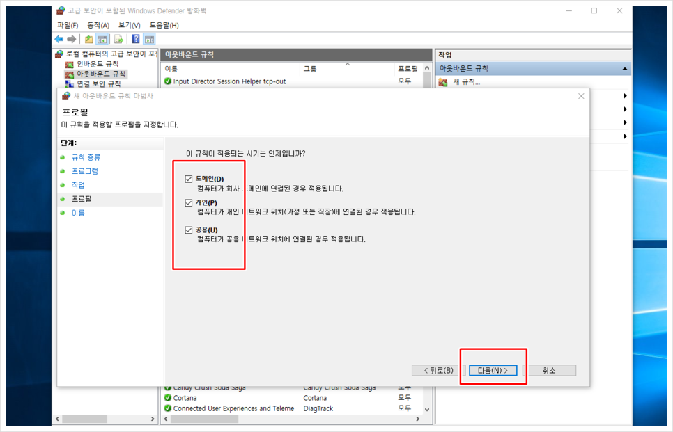 위에 보이는 바와 같이 도메인, 개인, 공용 모두 체크된 거 확인 후