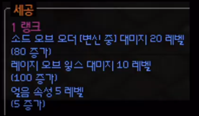 위의 옵션을 보자. 소드 오브 오더(변신 중) 대미지 20레벨, 레이지 오브 윙스 대미지 10레벨, 얼음 속성 5레벨 이 적용되어 있다.