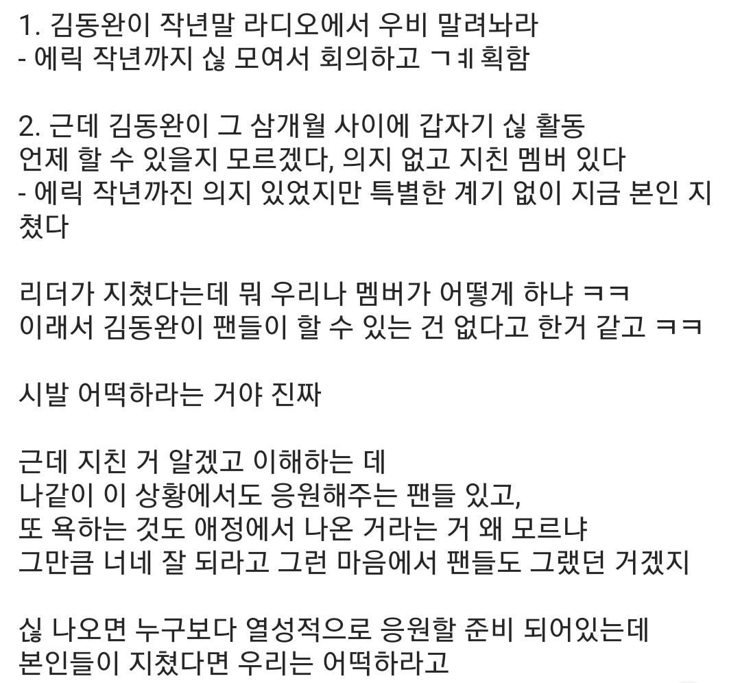 김동완 본인은 그룹활동에 애정이 있는것처럼 말해서 갤에서는 다른멤버들을 깠나봄(리더인 에릭은 더 많이 까인듯?)