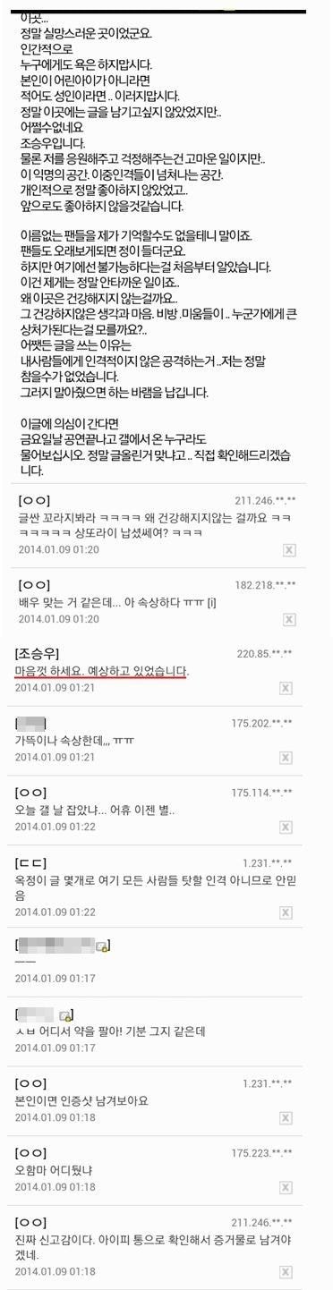 오죽 답이 없었으면 조승우가 직접 나서서 글을 썼을까 싶었겠지만, 글을 쓴 당사자가 조승우인 줄 몰랐던 디씨 조승우 갤러리의 인간들은