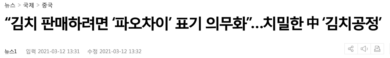 김치를 "한국식 파오차이"라고 표기함