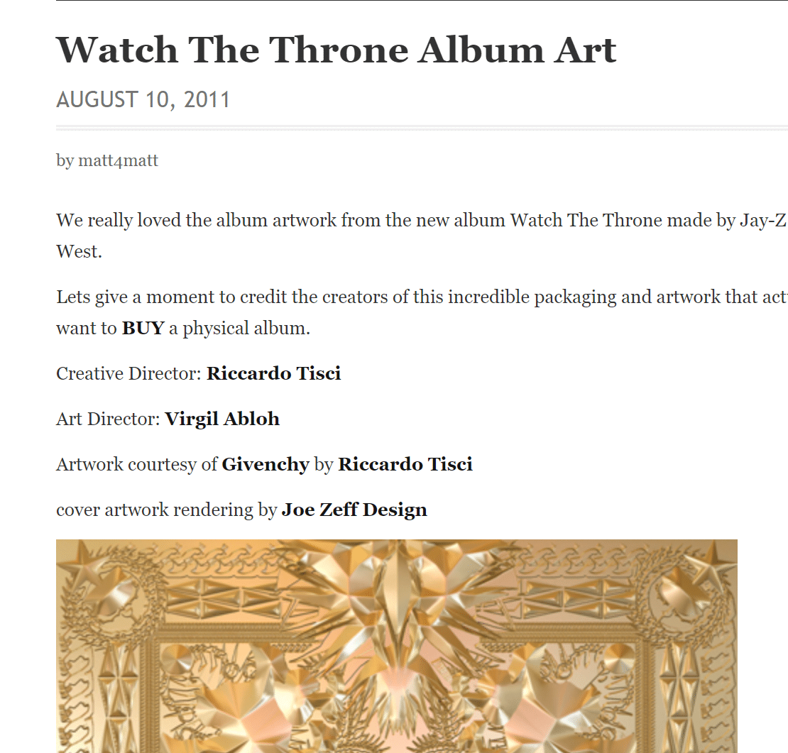 2011년 제이지와 칸예웨스트의 합작앨범 WATCH THE THRONE의 앨범 자켓 디자인에 참여하면서부터임