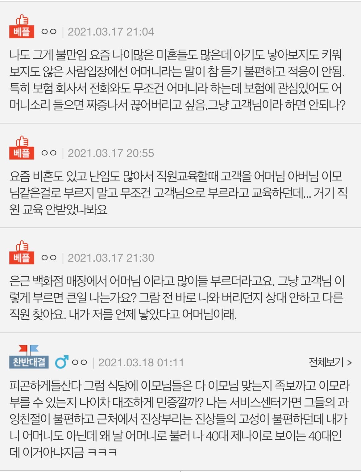 고객님 / 환자분 등등 대체 가능한 표현이 있고 딩크, 독신 많아 불편한데 왜 어머님이라고 하느냐?