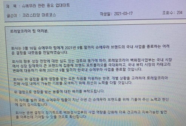 조선비즈가 22일 단독 입수한 이메일 서한에 따르면 크리스티앙 마르코스 아르나이 로레알코리아 대표는 지난 17일 직원들에게 "슈에무라 팀에게 올해 9월 말까지 슈에무라 브랜드의 국내 사업을 종료하는 어려운 결정을 내렸다"고 밝혔다.