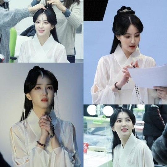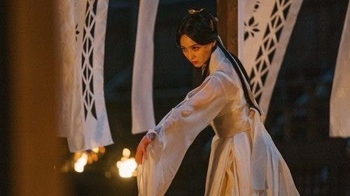 드라마 속에 나온 국가 소속 무녀의 모습. 머리를 풀어 헤치고, 흰 의복을 입고 있음.