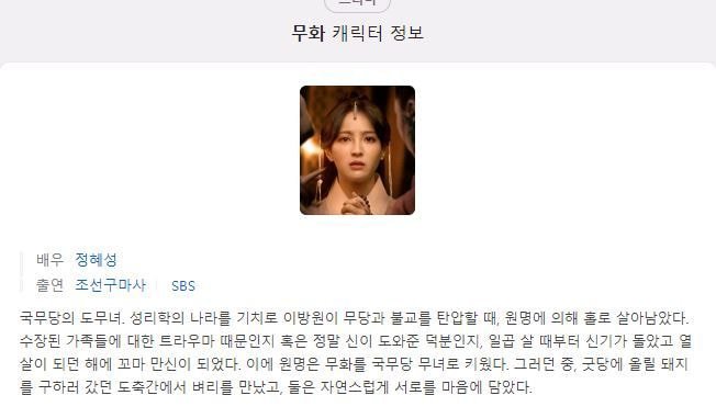 드라마 등장인물 소개에 따르면 정혜성이 맡은 캐릭터는 '국무당'의 무녀라는 '무화'