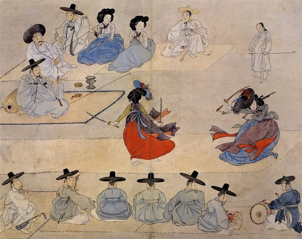 조선시대의 화가 '신윤복'의 작품 '쌍검대무(雙劍對舞)'와 '무녀신무 (巫女神舞)'에서의 모습과 같이 가채를 쓰고 머리를 묶고 있음.