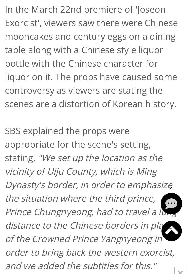 논란부분은 '극중에서 중국인이랑 식사할때 월병이랑 중국오리알, 중국 술병이 나왔고 중국풍 식탁에서 식사했다는 거랑 실존 인물들로 역사왜곡됐다고 함~' 딱 이렇게!!만 쓰고 (내가 요약한거 아님)