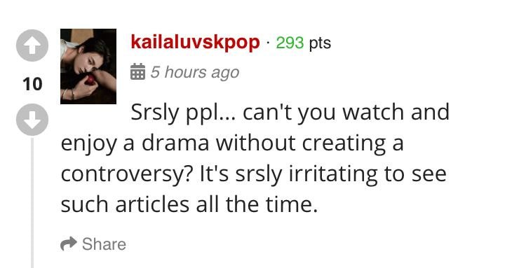 번역: 아 진짜 인간들아...그냥 드라마를 즐길 순 없는거야? 이렇게 논란 창조하지 말고? 나 진짜 이런 기사 맨날보는거 너무 짜증나.
