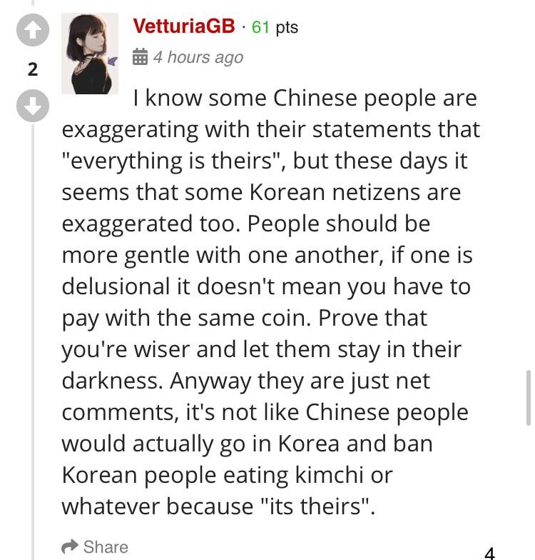 번역: 몇몇 중국인들이 모든게 자기들거라고 과장해서 말하고있다는건 알아. 하지만 요새는 몇몇 한국인들도 너무 과열됐어. 사람들은 다른 이들에게 더 친절해질 필요가 있고, 한쪽이 망상하고 있다고해서 그게 너까지 똑같아져야된다는 뜻은 아니야. 너희가 더 지혜롭다고 보여줘야지, 그리고 그들은 그냥 잊혀지게 내버려둬. 어쨌든 그건 그냥 인터넷상의 댓글일 뿐이지 실제로 중국인들이 "자기들"거란 이유로 한국에 와서 한국인더러 김치를 못먹게하거나 그런 것도 아니잖아.