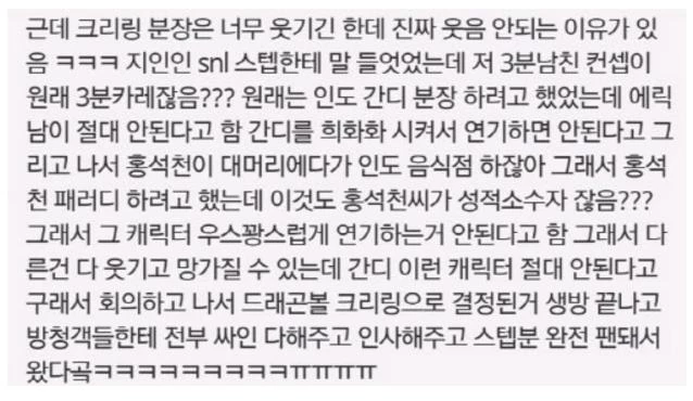 방송 이후 온라인 커뮤니티와 SNS 등에서는 제작진이 처음 에릭남에게 요구했던 캐릭터는 크리링이 아니었다는 주장이 퍼졌다. 온라인 커뮤니티 이용자는 지인이 SNL 스태프라서 이야기를 전해들었다면서 "원래 3분 남친 콘셉트가 3분 카레라서 인도 간디 분장을 하라고 했는데 에릭남이 절대 안 된다고, 간디를 희화화 시켜서 연기하면 안 된다고 했다더라"라고 전했다.