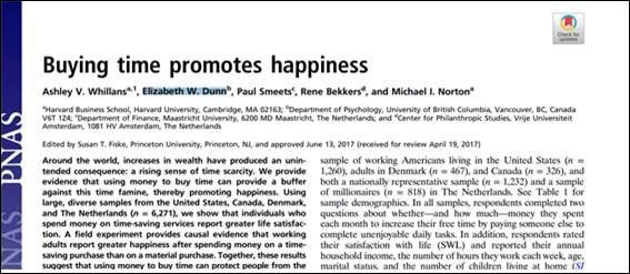 3, 시간을 구매하라. 네덜란드, 미국, 캐나다, 덴마크에서 시행된 하버드의 대규모 연구에서 ‘시간 구매’가 물건을 구입하는 것보다 행복에 더 많이 기여한다는 결과가 나왔다. 시간 구매란 인부를 고용해 집안일을 처리하는 것처럼 귀찮은 일들을 남에게 맡겨 여유시간을 확보하는 행위를 말한다. 시간 구매는 임금을 주고 다른 사람을 고용하는 거창한 일 뿐 아니라 사소한 일들에도 적용할 수 있다. 몇천원을 아끼기 위해 더 멀리 있는 할인마트에 가고, 집세를 아끼기 위해 통근시간이 더 들더라도 비교적 저렴한 곳에 거주하던 노력들을 정반대로 시행하면 된다. ‘생민’의 관점에서 보면 ‘스튜핏’ 한 일들이지만 행복 총량으로 따지자면 ‘그뤠잇’일 수 있다.