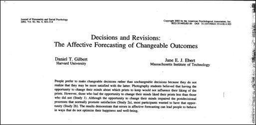 하버드의 심리학 교수 댄 길버트가 테드 강연에서 소개한 실험을 살펴보자. 연구진들은 하버드생들을 대상으로 사진수업을 열었다. 학생들에게 사진 12장을 찍게 한 다음, 그 중 가장 마음에 드는 2장을 선택하게 만들었다. 약간의 시간이 흐른 뒤, 두 장 중 한 장만 집에 가져가도록 했다. 학생들 중 절반에겐 나흘간 교환할 수 있는 시간을 주고, 나머지 절반에겐 주지 않았다. 연구진은 좀 더 심사숙고해 사진을 결정할 수 있었던, 교환기회가 있는 그룹의 만족도가 더 높으리라고 예상했다.