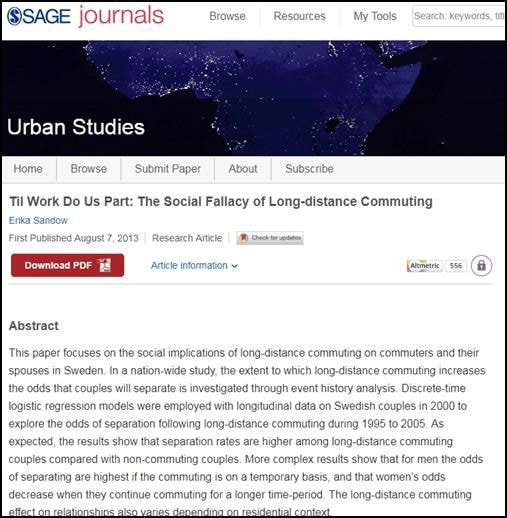 2013년 스웨덴 우메아대학의 연구에 따르면, 11년동안 200만 가구의 기록을 조사한 결과, 한쪽 배우자가 매일 45분 이상 통근할 때 이혼 할 확률이 40% 높다는 것을 발견했다. 연구팀은 이에 대해 '통근시간이 오래 걸릴수록 집안일이나 여가에 신경 쓸 체력이 없기 때문에 부부싸움이 잦아지고 결국 이혼에까지 이를 수 있다'고 설명했다. 미국 코넬대학의 연구에서도 장거리 출근자에게서 스트레스 호르몬인 코르티솔 수치가 더 높게 나왔다. 또한 그들은 출근 후 연구팀이 부과한 과제 수행을 더 힘들게 느꼈다. 연구진은 장기간 쌓인 스트레스가 만성 피로 등으로 이어질 수 있다고 경고했다.