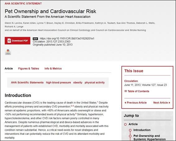 반려동물이 정신건강 뿐 아니라 몸의 건강에도 좋다. 2013년 미국심장협회는 반려동물을 기르면 혈압과 콜레스테롤 수치가 떨어지고 덜 뚱뚱해진다고 밝혔다. 산책시켜주는 등 신체활동이 늘어나 심혈관계 질환이 줄어든다는 것이다.