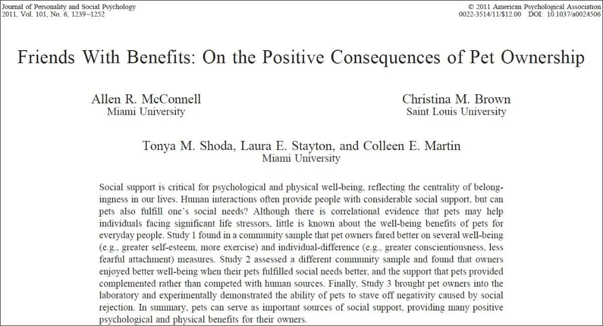 애완동물이 주는 사랑, 즐거움은 우리에게 어떤 효과를 줄까. 미국심리학협회에서 2011년 발표한 연구에 따르면, 반려동물은 사람의 사회적‧정서적 지원의 중요한 원천이 된다. 반려동물을 키우는 사람들이 자부심이 크고, 육체적으로 건강하고 외롭지 않았다. 자신의 상황에 상관없이 반려동물이 사회적 욕구를 충족하고 스트레스를 감소시키기 때문이다.