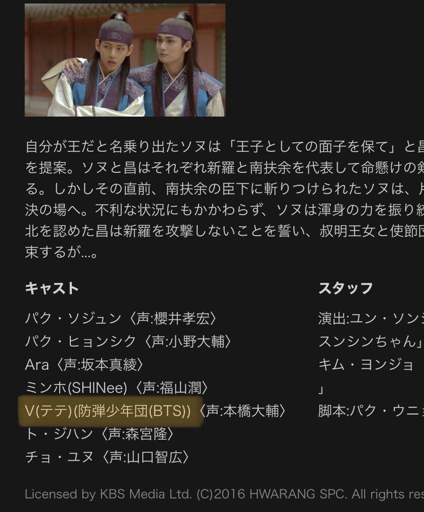 일본 스트리밍 사이트에선 뷔가 나온 드라마 화랑 출연진 소개에
