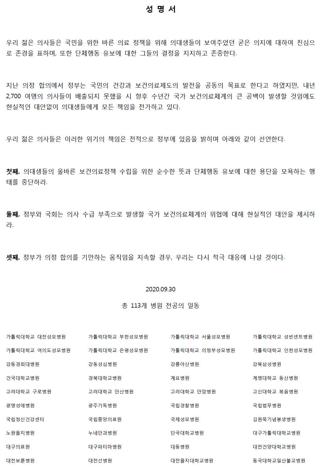 30일 113개 병원 전공의와 서울아산병원 소속 전임의는 성명서를 통해 "내년 2700명의 의사들이 배출되지 못했을 시 향후 수년간 국가 보건의료체계에 큰 공백이 발생할 것"이라며 "정부는 현실적인 대안없이 의대생들에게 모든 책임을 전가하고 있다"고 말했다.