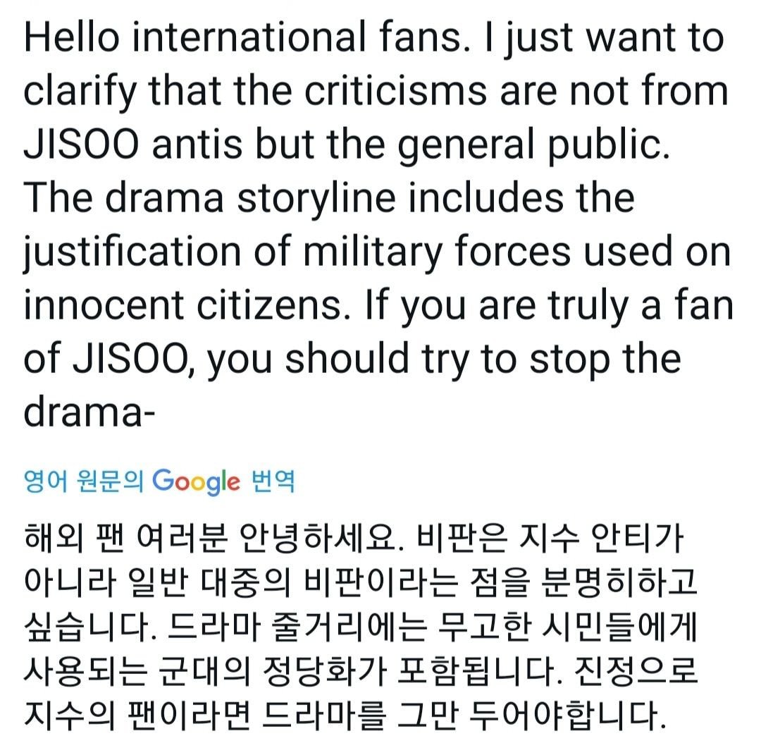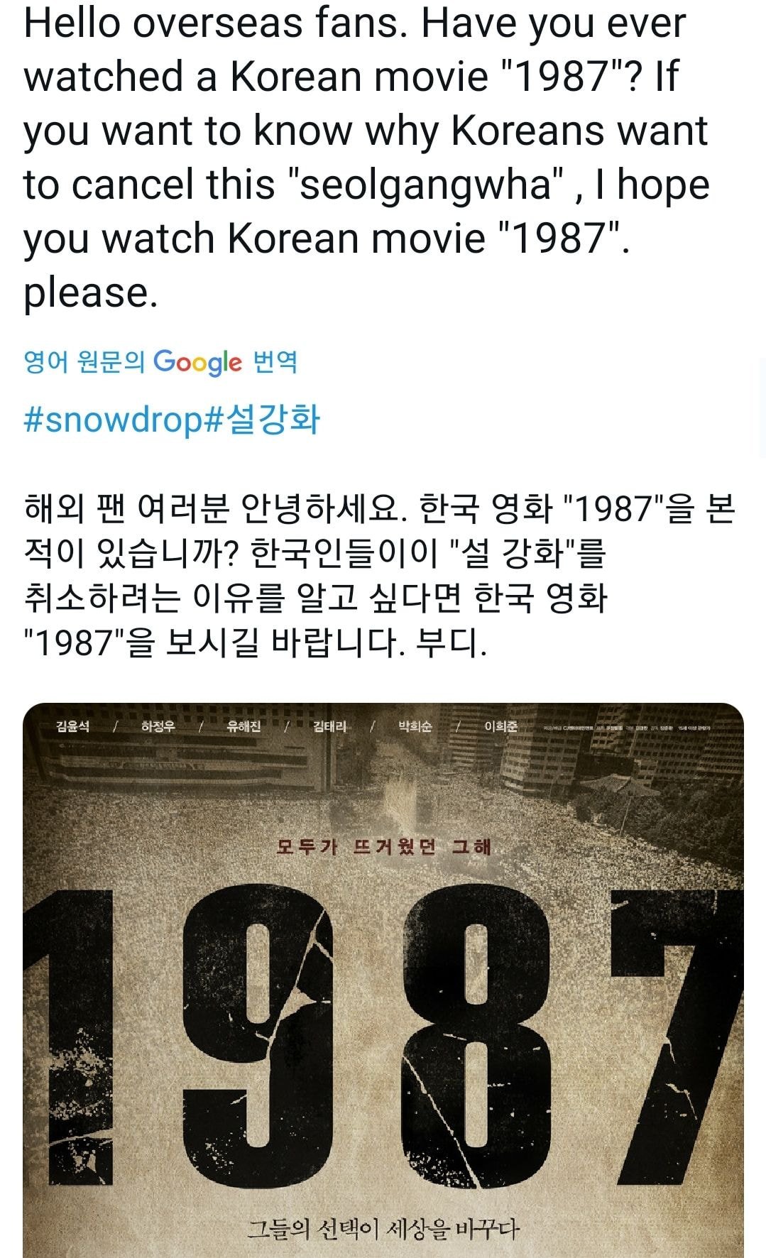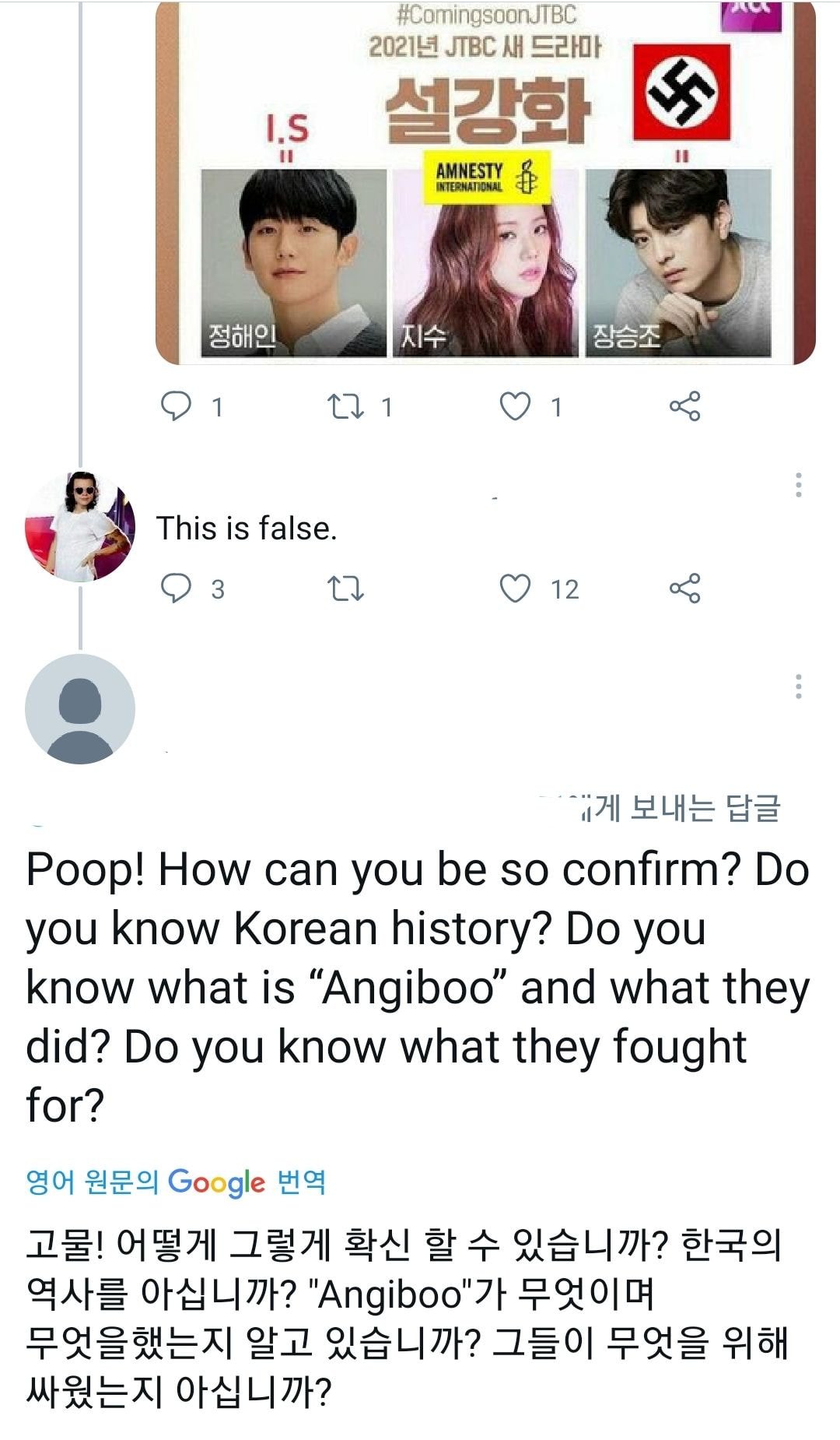 Jtbc 설강화 관련 입장문이라고 올라온 트윗에 많은 해외팬들이 댓글을 달았고 그로인해 한국팬들이 영어로 설명해주는 답글을 많이 달아뒀는데 인상 깊어서 몇개 가져옴