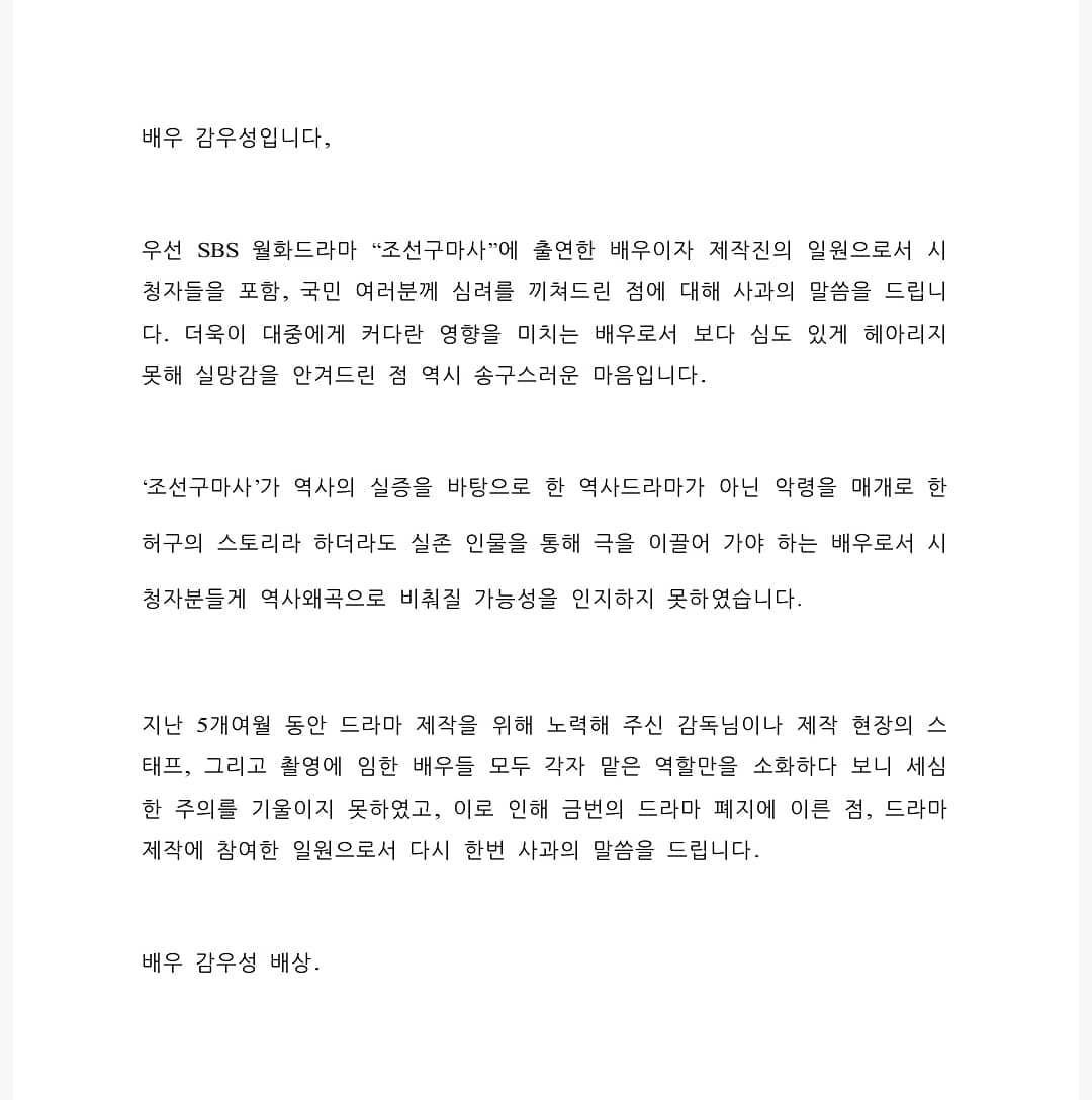 | '조선구마사' 감독 "역사왜곡, 모든 책임은 감독인 내 부족함, 죄송"[전문] (0) | 2021.03.28 |