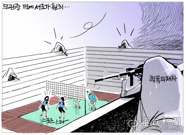 심지어 2021년 2월 15일자 만평에서는 학폭피해자를 저격수로 표현하는 만평도 올림.