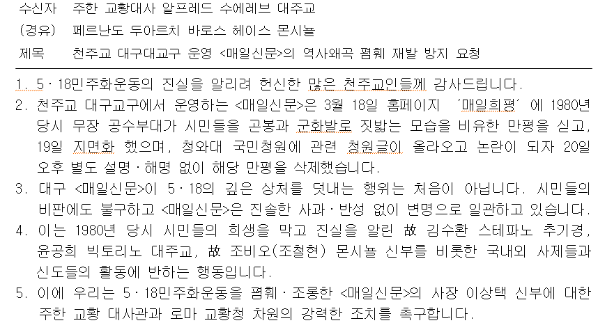 5. 3월 24일 5·18기념재단에서 매일신문에 대해 신문윤리위와 교황청에 강력한 조치 요구함. (매일신문 사장이 신문윤리위 이사장, 대구 대교구 소속)