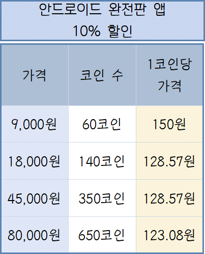 일반 충전시 코인단가랑 비교해보고 여유가 있으면 가장 큰 단위로 충전하는게 좋다