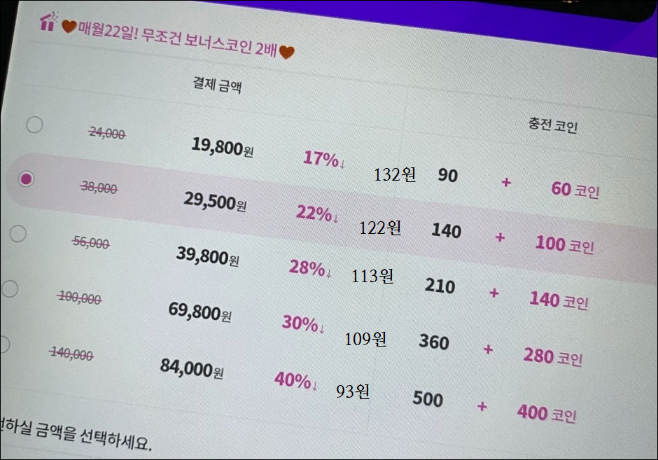 2만원짜리가 젤 가성비가 나음. 1코인당 125원