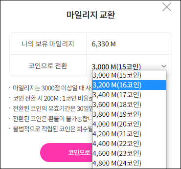 3천마일리지부터 교환가능함 3천m=15코인 (웹툰 5화분량 소장가능한 양)