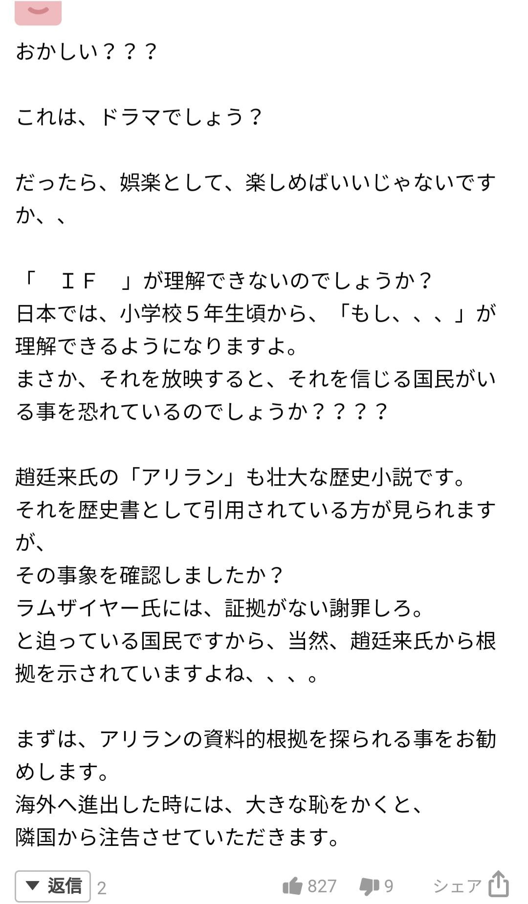 >이상해??? 이건 드라마지? 그럼 오락으로 즐기면 되겠네요..「IF」를 이해할 수 없는 것일까요? 일본에서는 초등학교 5학년때부터 '만약...'을 이해할 수 있게 돼요 설마 그걸 방영하면 그걸 믿는 국민이 있을까봐 두려워하는걸까? 조정래씨의 아리랑도 웅장한 역사소설입니다 그것을 역사책으로 인용하시는 분이 보이던데 그 사상을 확인하셨습니까? 램지어씨에게는 증거가 없어 사과를 해라 라고 압박했던 국민이기 때문에 당연히 조정래씨로부터 근거를 제시받았겠죠 자 먼저 아리랑의 자료적 근거를찾으시기를권해드립니다 해외에 진출하였을 때에는 크게 망신을 당할거라고 이웃나라에서 충고해 드리겠습니다