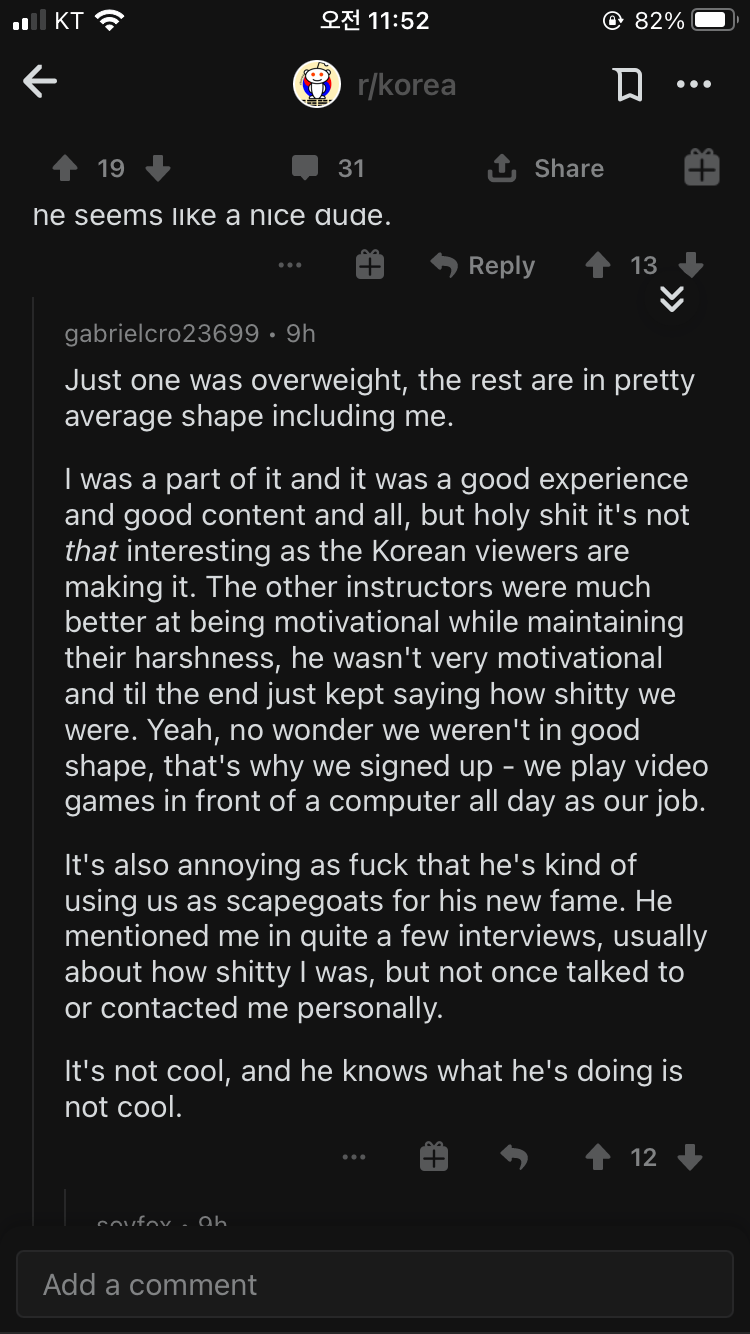 나는 가짜사나이는 좋은 경험이고 좋은 컨텐츠라고 생각하지만 한국인 시청자들이 말하는것만큼 (이근대위)가 그렇게 흥미롭진 않은것 같아. 다른 교관들이 빡셈을 유지하면서도 동기부여를 해주는 역할을 더 잘했다고 생각해. 그는 별로 동기부여적이지 않았고 끝까지 그냥 우리가 얼마나 ㅂㅅ인지에 대해서만 말했어. 그래, 당연히 우리 몸이 안좋지- 우리는 컴퓨터 앞에서 하루종일 게임하는게 직업이니까.