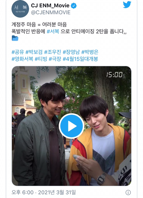 “계정주 마음 = 여러분 마음 폭발적인 반응에 #서복 으로 안티에이징 2탄을 풉니다,,📂 #공유 #박보검 #조우진 #장영남 #박병은 #영화서복 #티빙 #극장 #4월15일대개봉 https://t.co/5rskArUrYl”