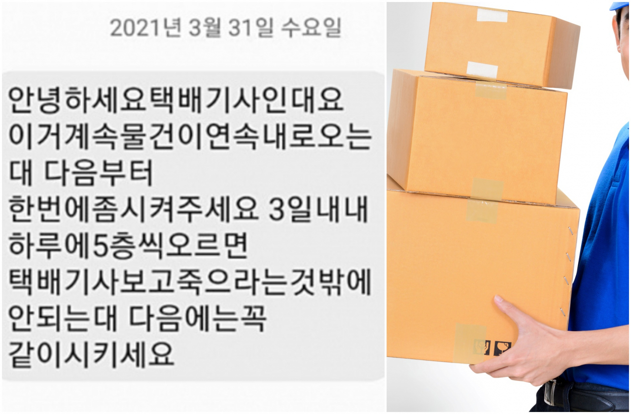 [헤럴드경제=뉴스24팀] 엘리베이터가 없는 건물에 사는 한 주민이 택배기사로부터 받은 문자가 공개돼 논란이 일고 있다.