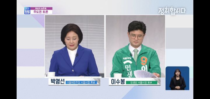 박영선 후보: 네 우선은 자원을 재생하는 정책을 크게 키워야 할 거다. 라고 생각하고 있습니다. 구독경제에 이야기를 오세훈 후보께서 일부러 하신 거 같은데요 구독경제를 하더라도 자원이 재생되는 그런 원료를 쓰게 되면 그리고 이러한 요즘은 용기백배(뭐라하는지 정확히 안 들림 본인이 그릇가지고 다니면서 포장하는 걸 말하는 듯) 우선은 이런 정책을 쓰는 것이 가장 중요하고요