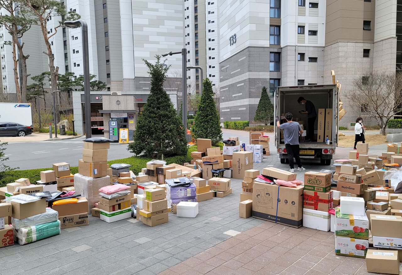 1일 오후 5시쯤 서울시 강동구의 한 대규모 아파트 단지. 5000세대 가까운 대규모 단지 입구로 택배를 찾으러 온 주민에게 택배 기사가 고개 숙여 말했다. 이날 오후 4시쯤 이 단지 후문 주변엔 다양한 크기의 택배상자 수천개가 마치 돌탑 쌓듯 층층이 쌓여있었다. 주민들이 사방에 쌓인 박스 사이에서 자기 택배를 찾아가려 이리저리 박스를 들었다놨다 하며 혼란이 빚어졌다. 이 아파트가 이날부터 안전 사고와 도보 훼손 우려 등을 이유로 택배 차량의 단지 진입을 금지하며 벌어진 상황이다.