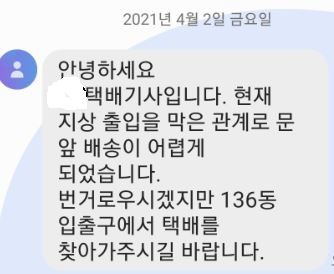 서울 강동구 한 아파트에서 최근 택배를 놓고 논란이 벌어지고 있다. 사진은 한 주민이 택배기사로부터 받은 문자. /남지현 기자