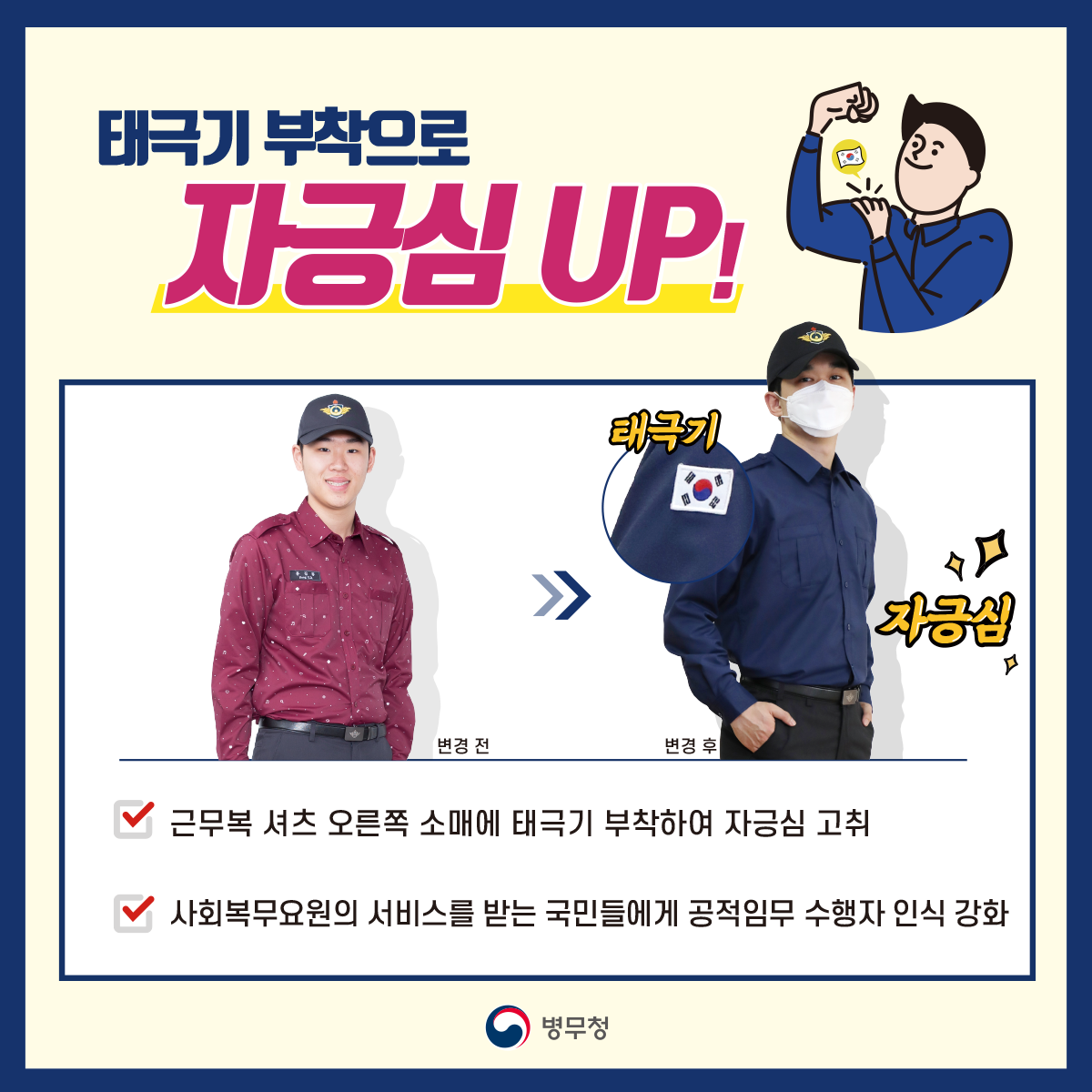 - 근무복 셔츠 오른쪽 소매에 태극기 부착하여 자긍심 고취