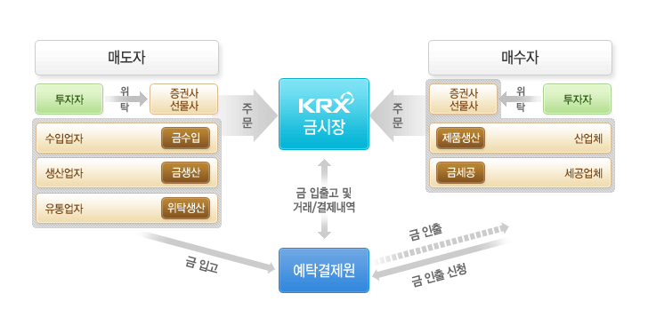 예를 들어 KRX금시장의 회원이 아닌 실물사업자나 투자자는 회원을 거쳐서 금을 인도받게 됩니다.