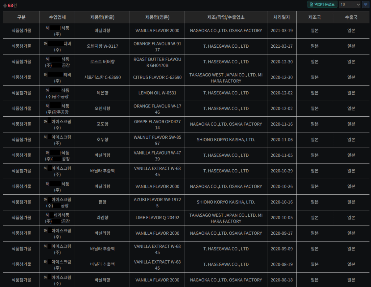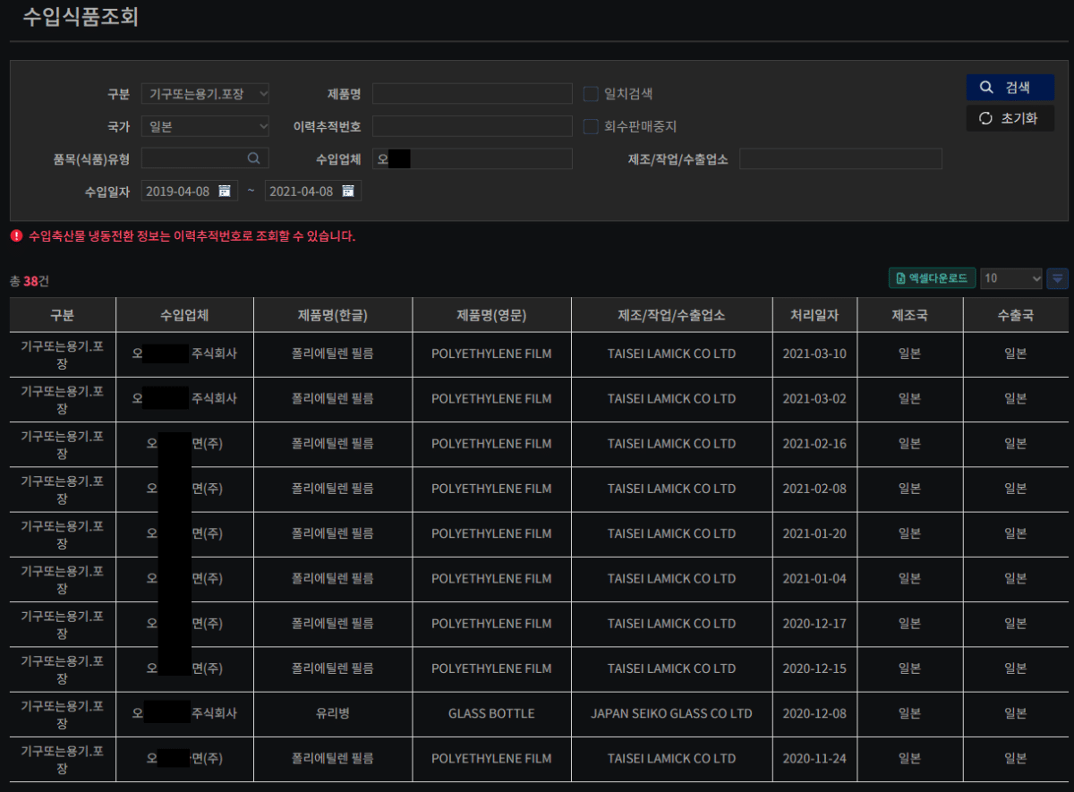 또 다른 기업에서 가공식품 포장지를 일본으로 부터 2020-2021년에 수입한것을 알 수 있음