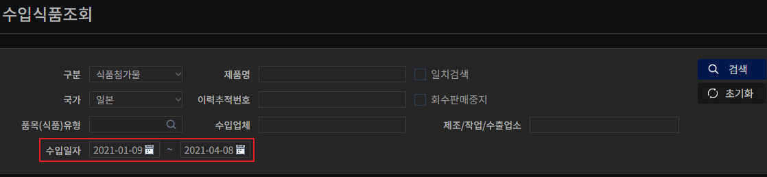 4. 수입업체 빈칸에 검색하고 싶은 업체 이름을 입력하고 오른쪽의 '검색' 버튼을 누른다.
