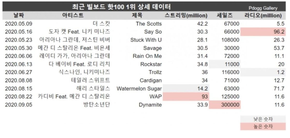 카디비 WAP가 역대급 수치를 뽑아서 그렇지 그 전 1위 곡들과 비교했을때 세일즈 아니어도 다른 수치들이 타 아티스트에 비해 뒤처지는 성적이