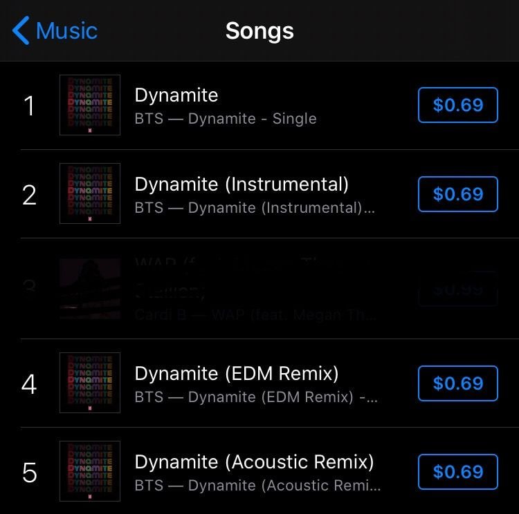 방탄소년단 다이너마이트 역시 덤핑할인을 적용해 정가 1.29달러가 아닌 그 절반 가격인 0.69달러에 판매를 시작했음.