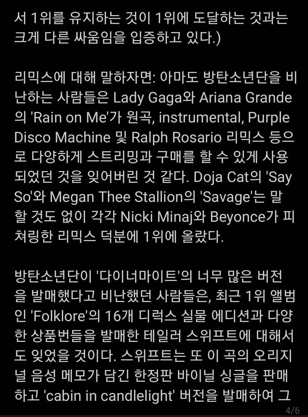 카디비 WAP가 역대급 수치를 뽑아서 그렇지 그 전 1위 곡들과 비교했을때 세일즈 아니어도 다른 수치들이 타 아티스트에 비해 뒤처지는 성적이