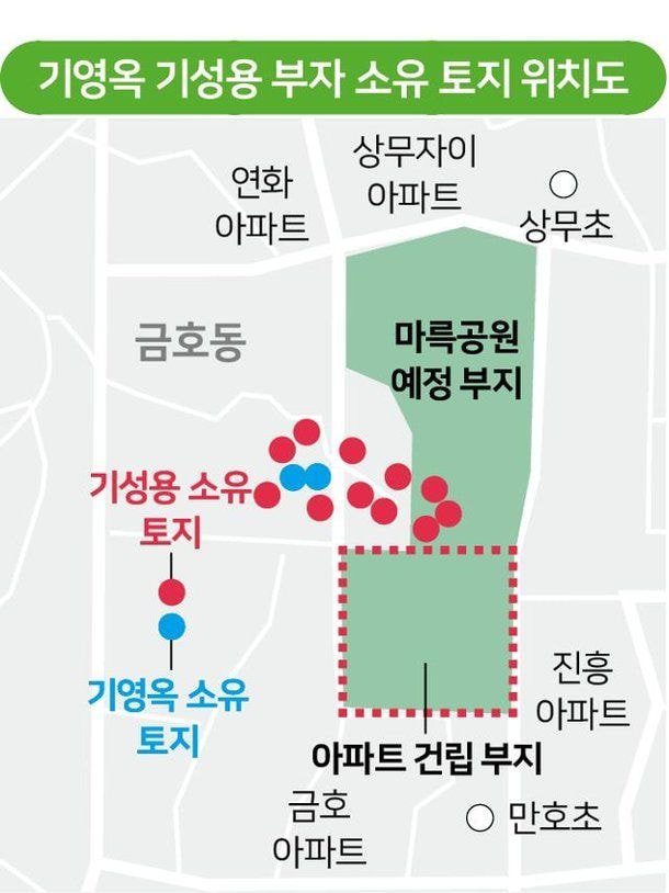 경찰 등에 따르면 기성용은 2016년 7~11월 4차례 걸쳐 금호동의 밭 6개 필지와 논 1개 필지 7,773㎡(약 2,351평)를 26억9,512만 원에 매입했다. 기성용은 앞서 2015년 7월과 11월에도 이 일대 잡종지 4개 필지 4,661㎡(1,409평)를 18억9,150만 원에 사들였다. 기 전 단장도 2015년 7월 인근 논 2개 필지 3,008㎡(909평)를 12억9,015만 원에 샀다. 이들 부자가 농지 등을 매입하는 데 쏟아부은 돈은 58억7,677만 원이다.
